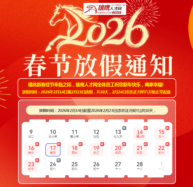 雄鷹人才網(wǎng)春節(jié)放假安排如下: